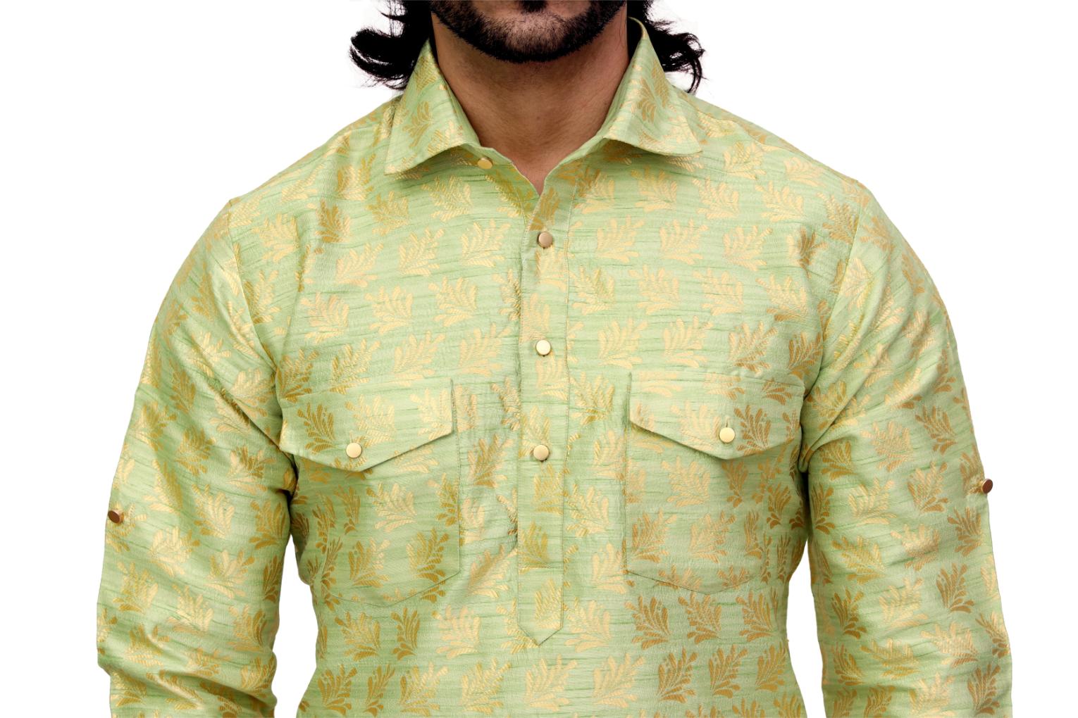 - Design: Classic Pathani kurta with collar, button placket, and flap pockets
